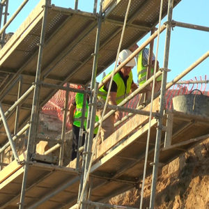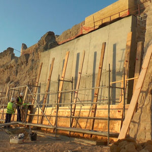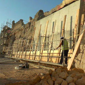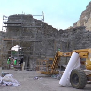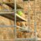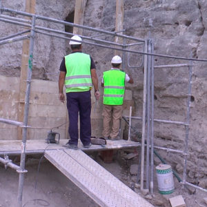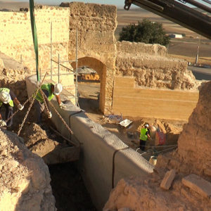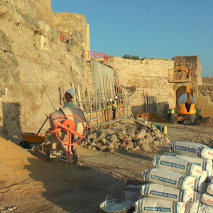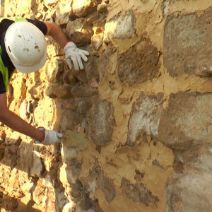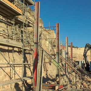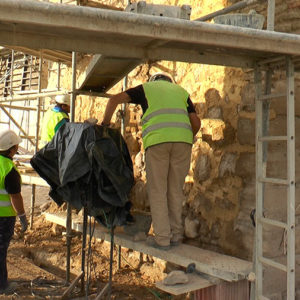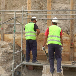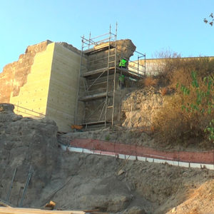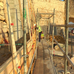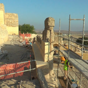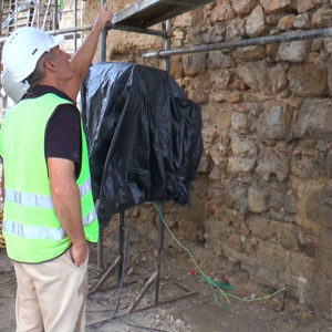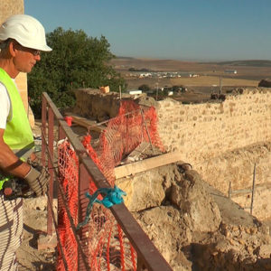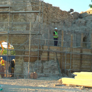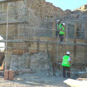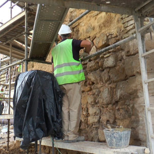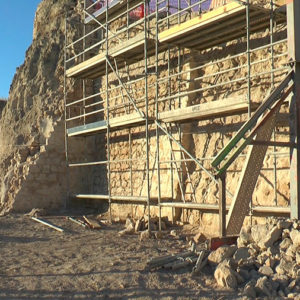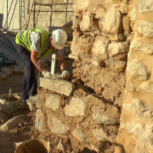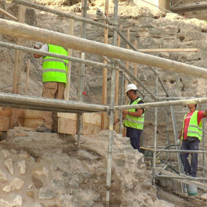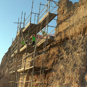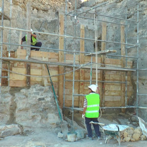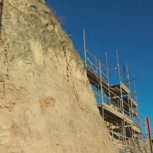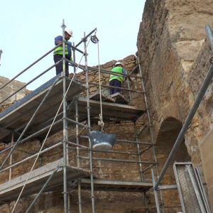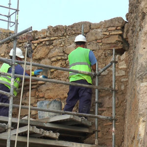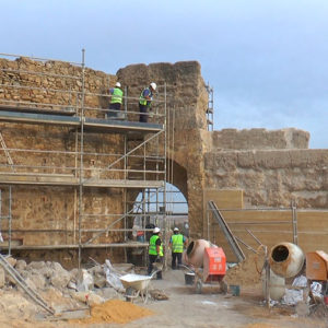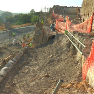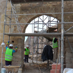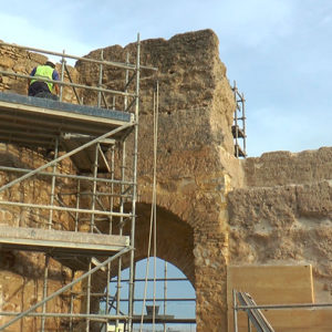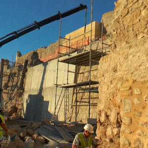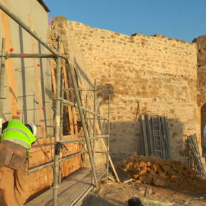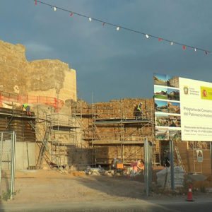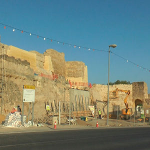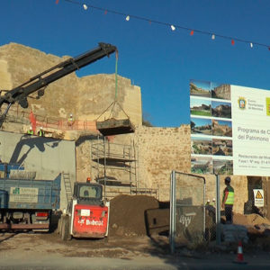 Empezamos Agosto con un avance importante en la consolidación y restauración de nuestra muralla. Prácticamente concluida la fase que afecta al arco del portillo, se está rehaciendo las torres adosadas en la parte exterior mientras que en el interior se rematan detalles del arco. Además se está procediendo al relleno de un lienzo de muro que estaba totalmente perdido, la base de éste está hecha de hormigón aunque se rematará con mortero y cal, dando un aspecto similar al que podemos apreciar en el nivel superior donde se ha restituido una parte del lienzo que había desaparecido. En este nivel inferior se ha perimetrado lo que es la torre 2, la zapata y las dimensiones que pudo tener, las actuaciones continuarán en las próximas semanas en esta zona, la más afectada por desprendimientos anteriores a 2007, cuando se actuó de urgencia y posteriores a ésta fecha recordamos el verano de 2014 en la que se precipitó un enorme fragmento de muralla en la que hoy se está trabajando. Se ha limpiado y colocado andamios para proseguir en esos puntos con la restauración en la que era más que patente el estado de abandono, desmoronamiento, suciedad y vegetación adosada. Hoy en día podemos apreciar que la recuperación de la muralla en esa zona está siendo muy fructífera e interesante para la conservación de nuestra historia.